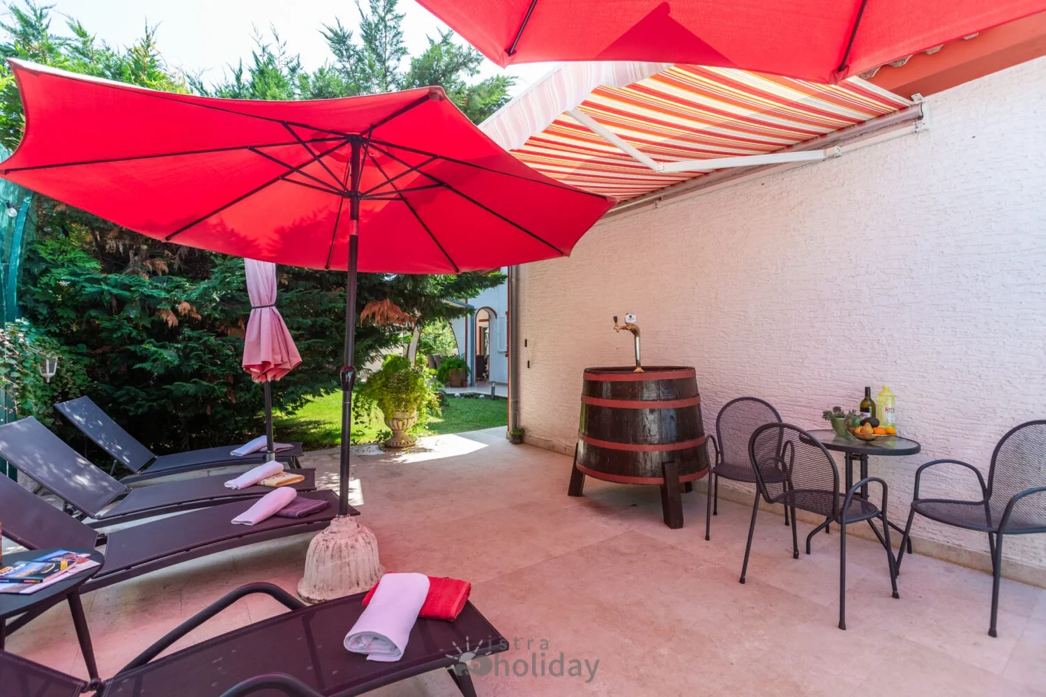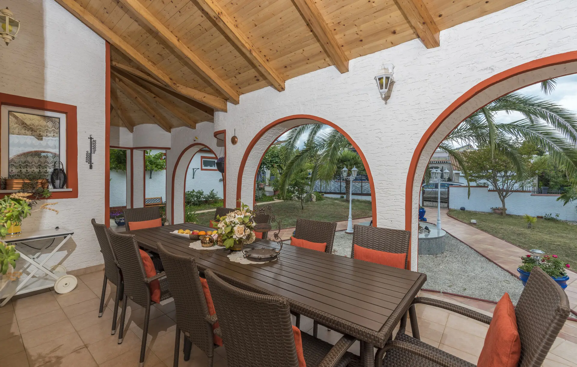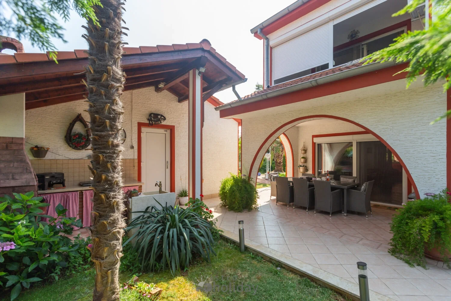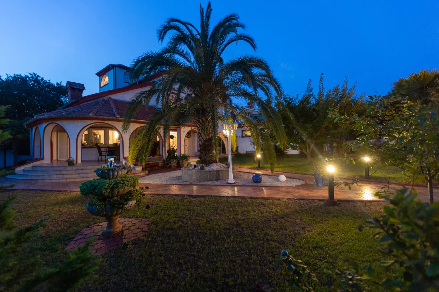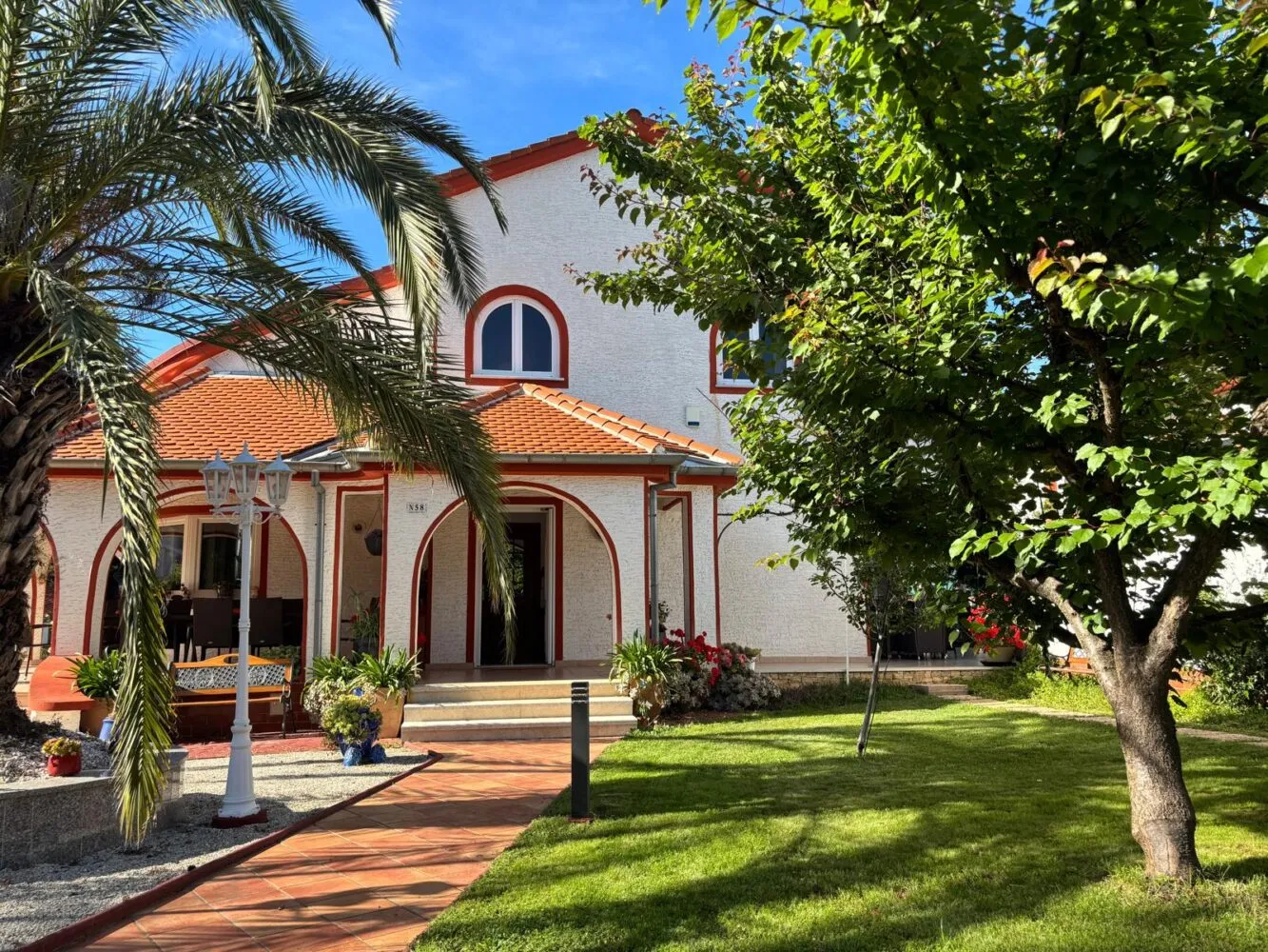 Surrounded by an idyllic, spacious, well-kept garden with a veritable floral oasis, Villa Aurea is located near the tourist center of Porec. This property can accommodate up to 8 guests, making it ideal for a vacation with friends or family. The garden, with natural shade provided by the beautiful, oversized palm trees, also features a seasonal private pool with sun loungers and a relaxation bed. You can prepare delicious grilled meals in the summer kitchen. The interior of the villa is exceptional. The open-plan ground floor houses the living room, a well-equipped kitchen, and a dining area. This area also includes a bedroom and a bathroom. From the kitchen, you have direct access to the covered terrace, where you can also enjoy your meals. Upstairs, there are two additional bedrooms, each with a balcony and a bathroom. A separate apartment with a living and dining area, a bedroom, a bathroom, and a balcony is ideal for guests who prefer more privacy. Another highlight is the villa’s tower, which offers stunning views of the Adriatic Sea. The property is fully air-conditioned. The beach is 2.5 km away. The a la carte restaurant is 0.5 km away. The market is 0.5 km away. Two garages and two additional parking spaces are available on the fully fenced property. We wish you a relaxing holiday at Villa Vallis Aurea.