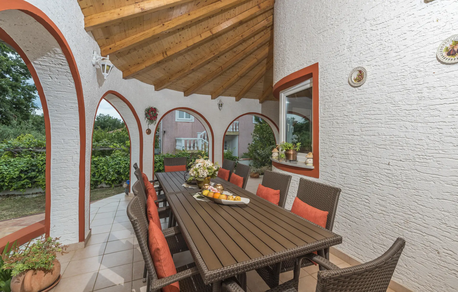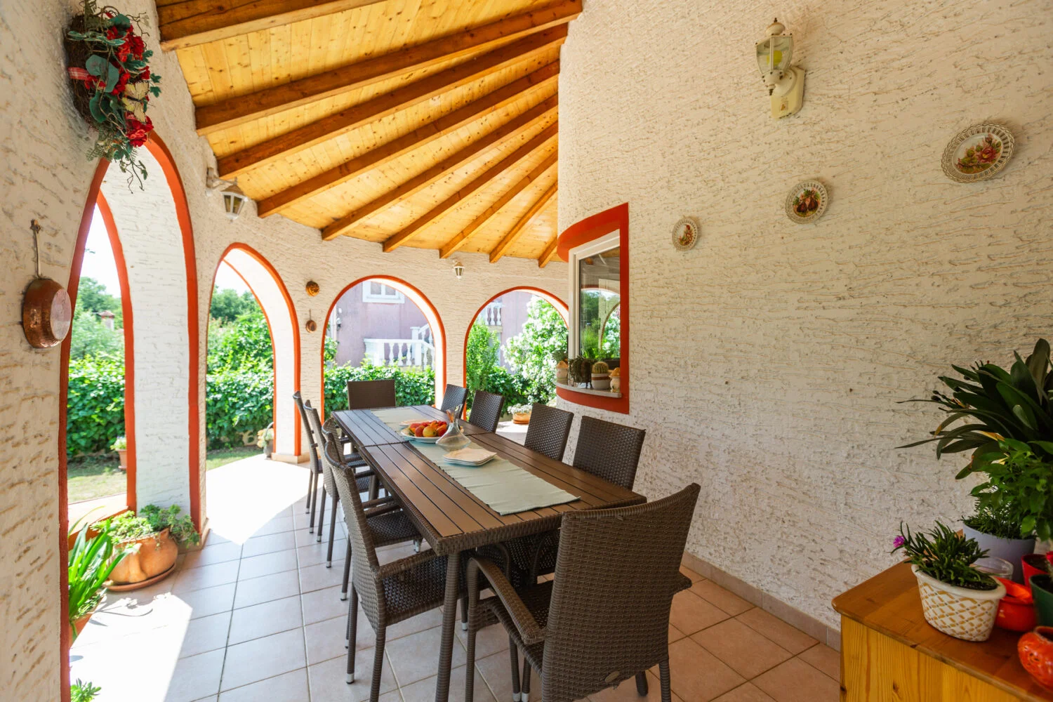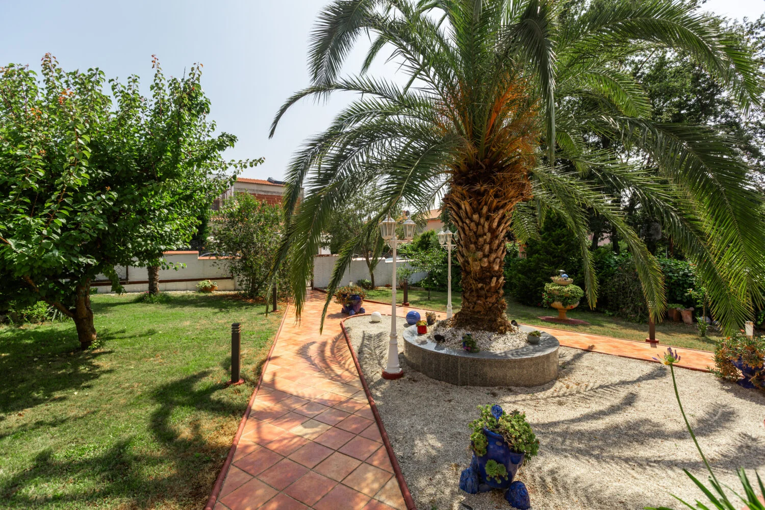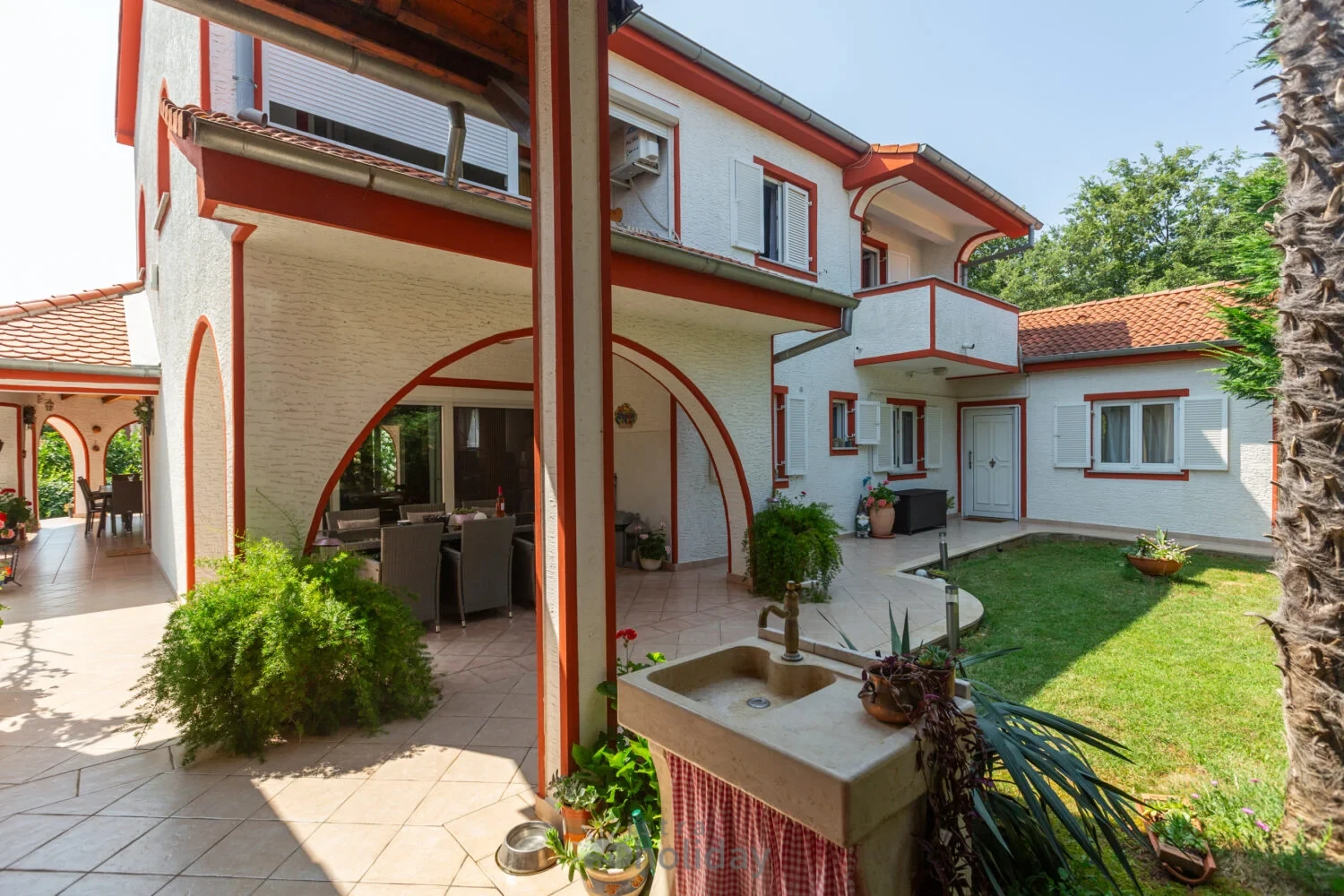 Surrounded by an idyllic, spacious, well-kept garden with a veritable floral oasis, Villa Aurea is located near the tourist center of Porec. This property can accommodate up to 8 guests, making it ideal for a vacation with friends or family. The garden, with natural shade provided by the beautiful, oversized palm trees, also features a seasonal private pool with sun loungers and a relaxation bed. You can prepare delicious grilled meals in the summer kitchen. The interior of the villa is exceptional. The open-plan ground floor houses the living room, a well-equipped kitchen, and a dining area. This area also includes a bedroom and a bathroom. From the kitchen, you have direct access to the covered terrace, where you can also enjoy your meals. Upstairs, there are two additional bedrooms, each with a balcony and a bathroom. A separate apartment with a living and dining area, a bedroom, a bathroom, and a balcony is ideal for guests who prefer more privacy. Another highlight is the villa’s tower, which offers stunning views of the Adriatic Sea. The property is fully air-conditioned. The beach is 2.5 km away. The a la carte restaurant is 0.5 km away. The market is 0.5 km away. Two garages and two additional parking spaces are available on the fully fenced property. We wish you a relaxing holiday at Villa Vallis Aurea.