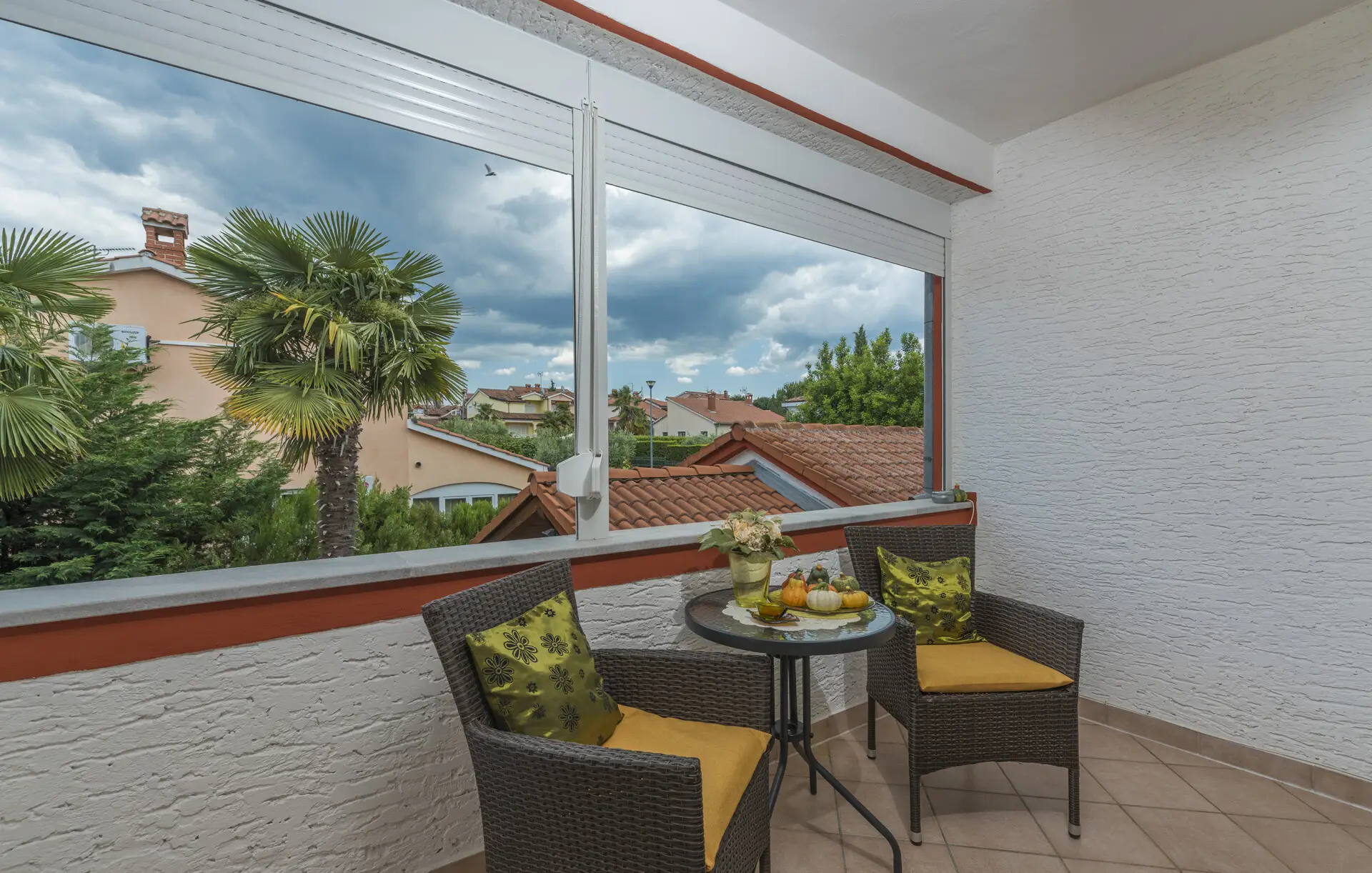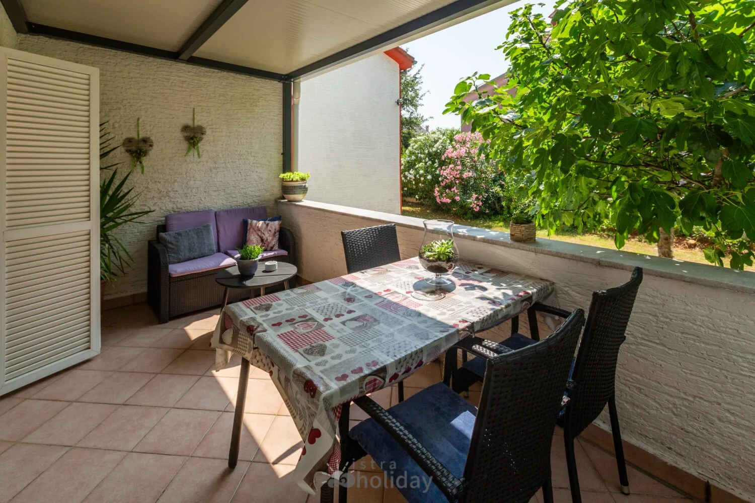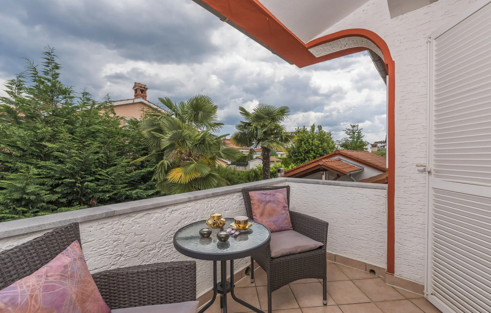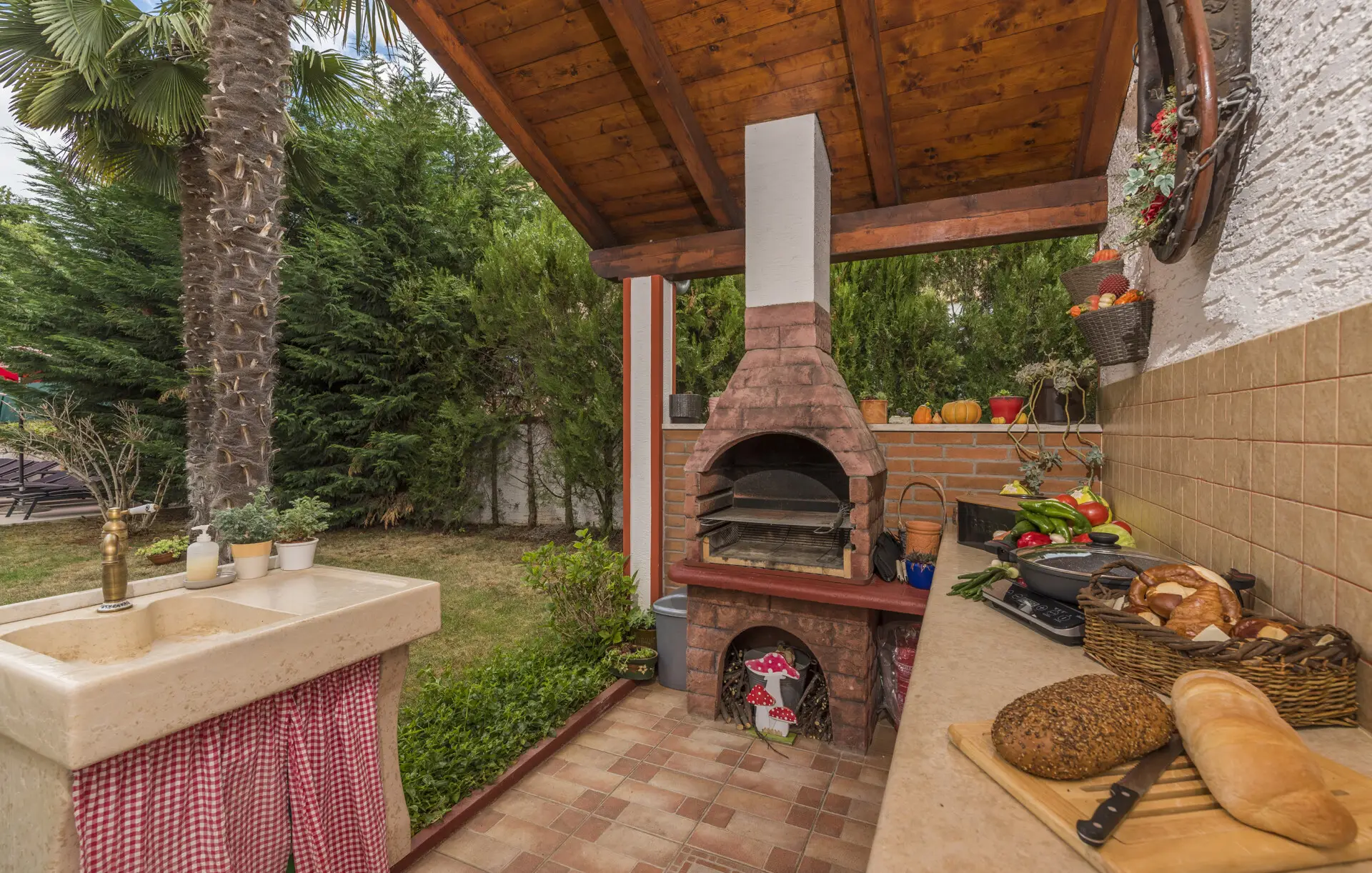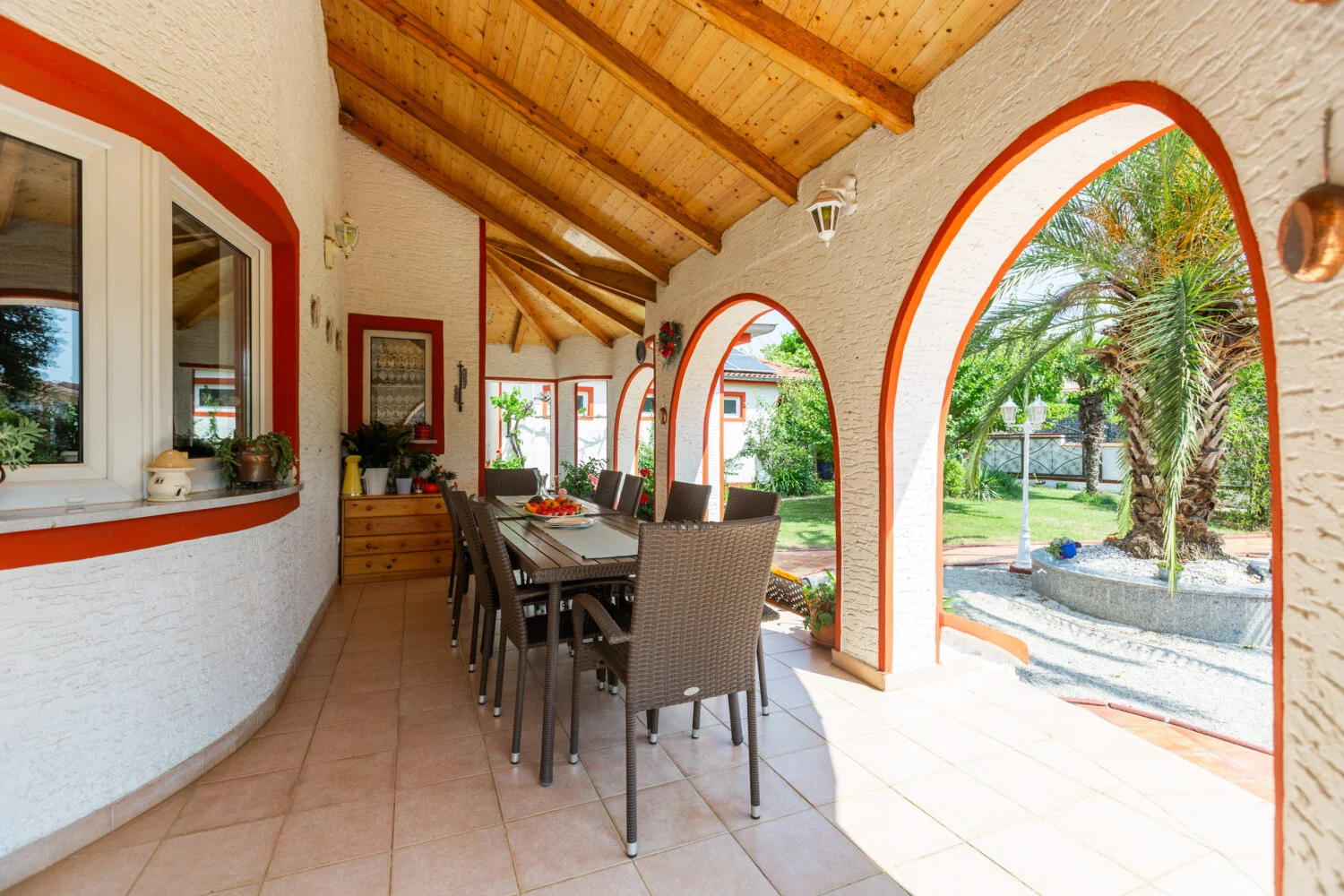 Surrounded by an idyllic, spacious, well-kept garden with a veritable floral oasis, Villa Aurea is located near the tourist center of Porec. This property can accommodate up to 8 guests, making it ideal for a vacation with friends or family. The garden, with natural shade provided by the beautiful, oversized palm trees, also features a seasonal private pool with sun loungers and a relaxation bed. You can prepare delicious grilled meals in the summer kitchen. The interior of the villa is exceptional. The open-plan ground floor houses the living room, a well-equipped kitchen, and a dining area. This area also includes a bedroom and a bathroom. From the kitchen, you have direct access to the covered terrace, where you can also enjoy your meals. Upstairs, there are two additional bedrooms, each with a balcony and a bathroom. A separate apartment with a living and dining area, a bedroom, a bathroom, and a balcony is ideal for guests who prefer more privacy. Another highlight is the villa’s tower, which offers stunning views of the Adriatic Sea. The property is fully air-conditioned. The beach is 2.5 km away. The a la carte restaurant is 0.5 km away. The market is 0.5 km away. Two garages and two additional parking spaces are available on the fully fenced property. We wish you a relaxing holiday at Villa Vallis Aurea.